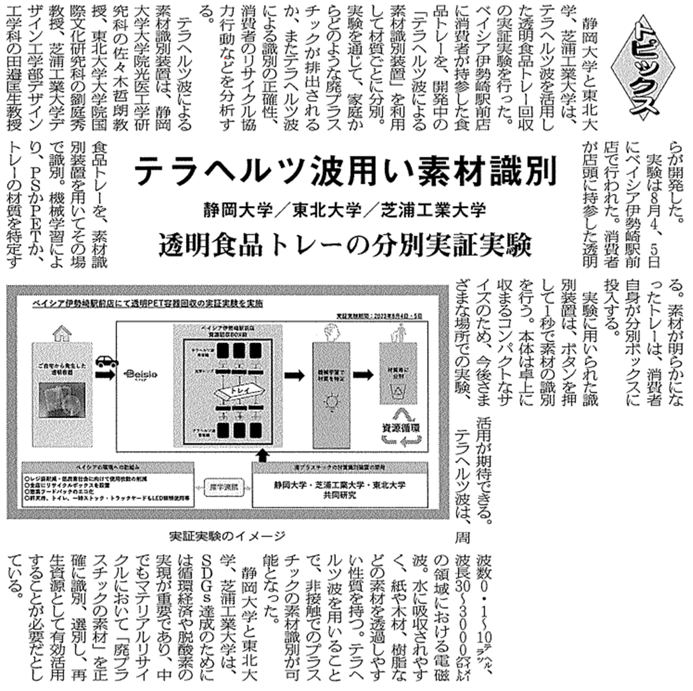 本研究科劉庭秀教授が、静岡大学大学院光医工学研究科の佐々木哲朗教授と芝浦工業大学デザイン工学部デザイン工学科の田邉匡生教授と共に、8月4日~5日に実施した「大型スーパー(ベイシア伊勢崎駅前店)で透明食品トレイ回収の社会実験とテラヘルツ波による素材識別装置の実証実験」に係る活動が、週刊包装タイムスで紹介されました。
