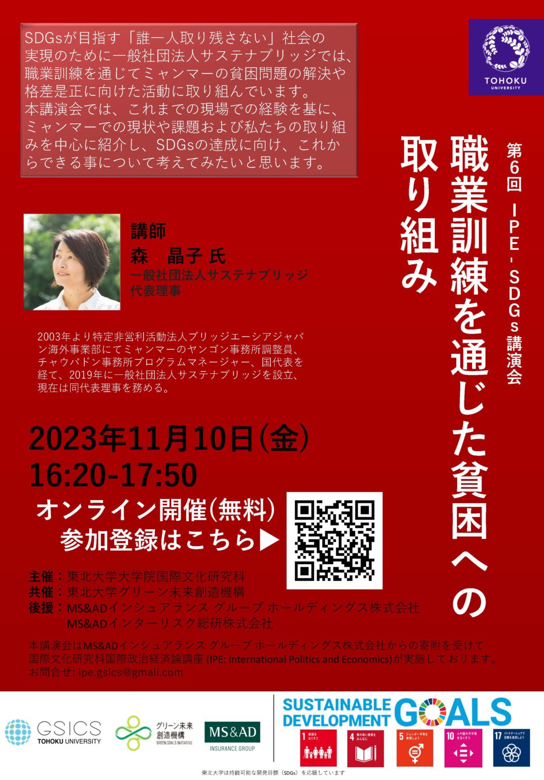 第6回 IPE-SDGs講演会「職業訓練を通じた貧困への取り組み」と題し、一般社団法人サステナブリッジ 代表理事の森 晶子氏をお招きし、講演していただきます