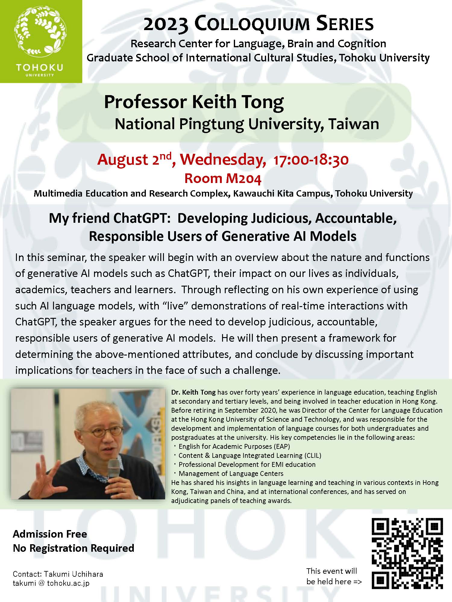 言語教育分野における最新の研究情報の理解、研究者間の国際交流、大学院生への教育という三つの学術的目的の達成のために、2023 Special Lecture Series を以下のように開催します。