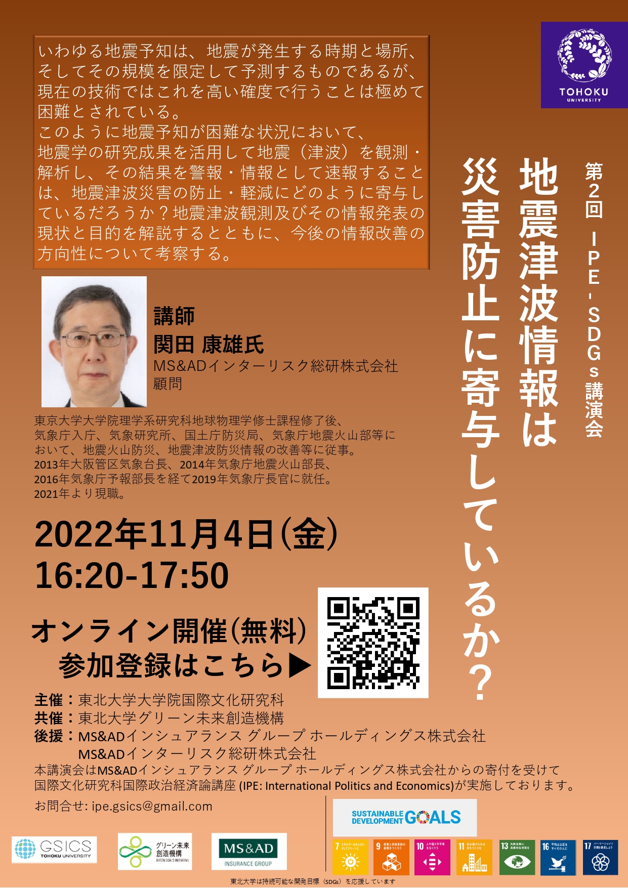 第2回 IPE-SDGs講演会ではMS&ADインターリスク総研株式会社顧問の関田康雄氏による「地震津波情報は災害防止に寄与しているか?」と題した講演会を開催します。