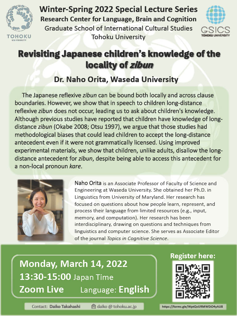 言語学分野における最新の研究情報の理解、研究者間の国際交流、大学院生への教育という三つの学術的目的の達成のために、Winter-Spring 2022 Special Lecture Series を以下のように開催します。