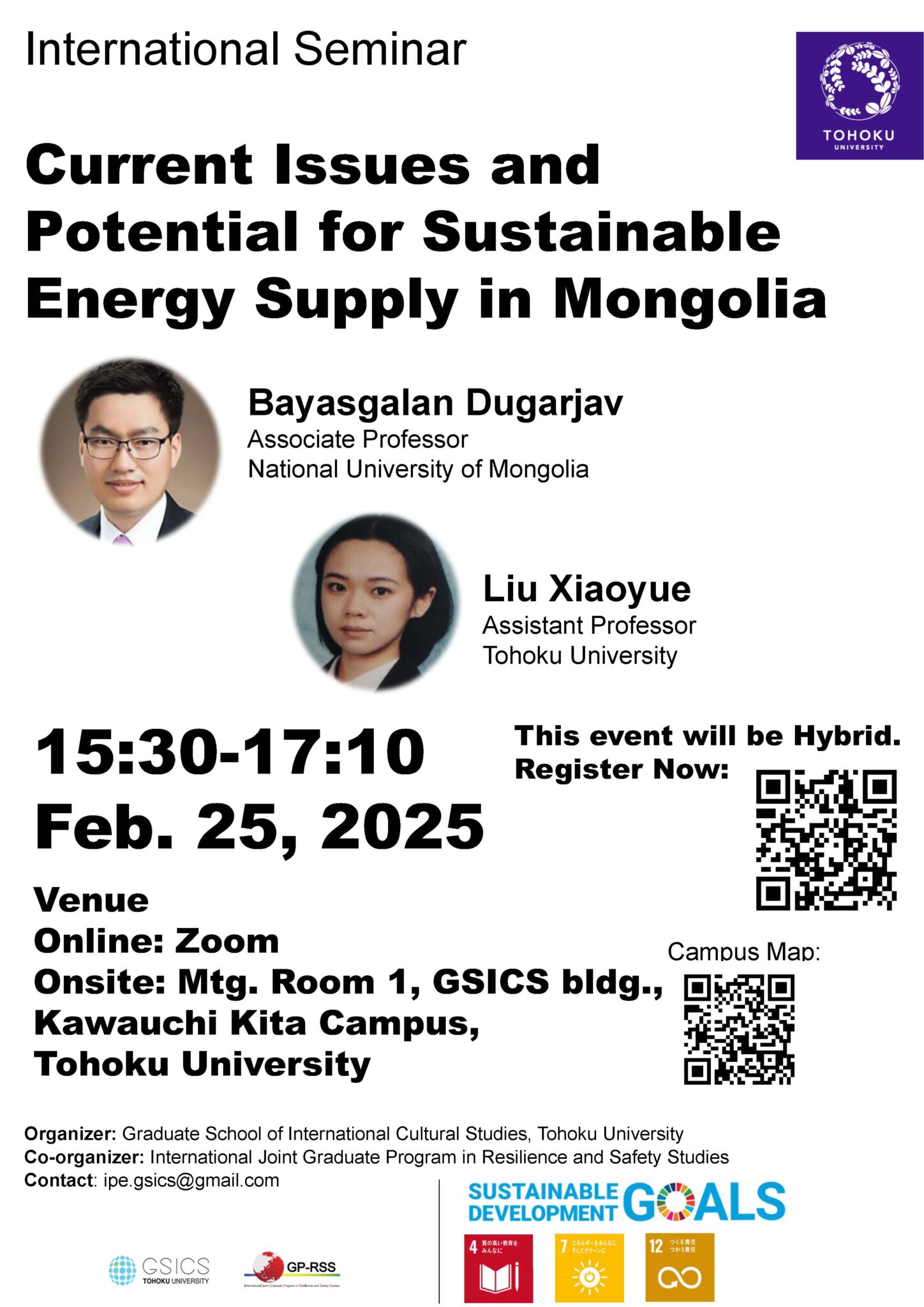 概 要:モンゴル国立大学のBAYASGALAN DUGARJAV准教授をお招きしてセミナーを開催します。セミナーでは、BAYASGALAN DUGARJAV准教授にモンゴルにおける持続可能エネルギー供給の取り組みとその課題、また今後のポテンシャルについてご講演いただきます。幅広い視野から多角的にエネルギー問題を捉え、考察します。またセミナーでは国際文化研究科の劉暁玥助教によるモンゴル遊牧民調査結果についても発信を行います。セミナーは英語で開催します