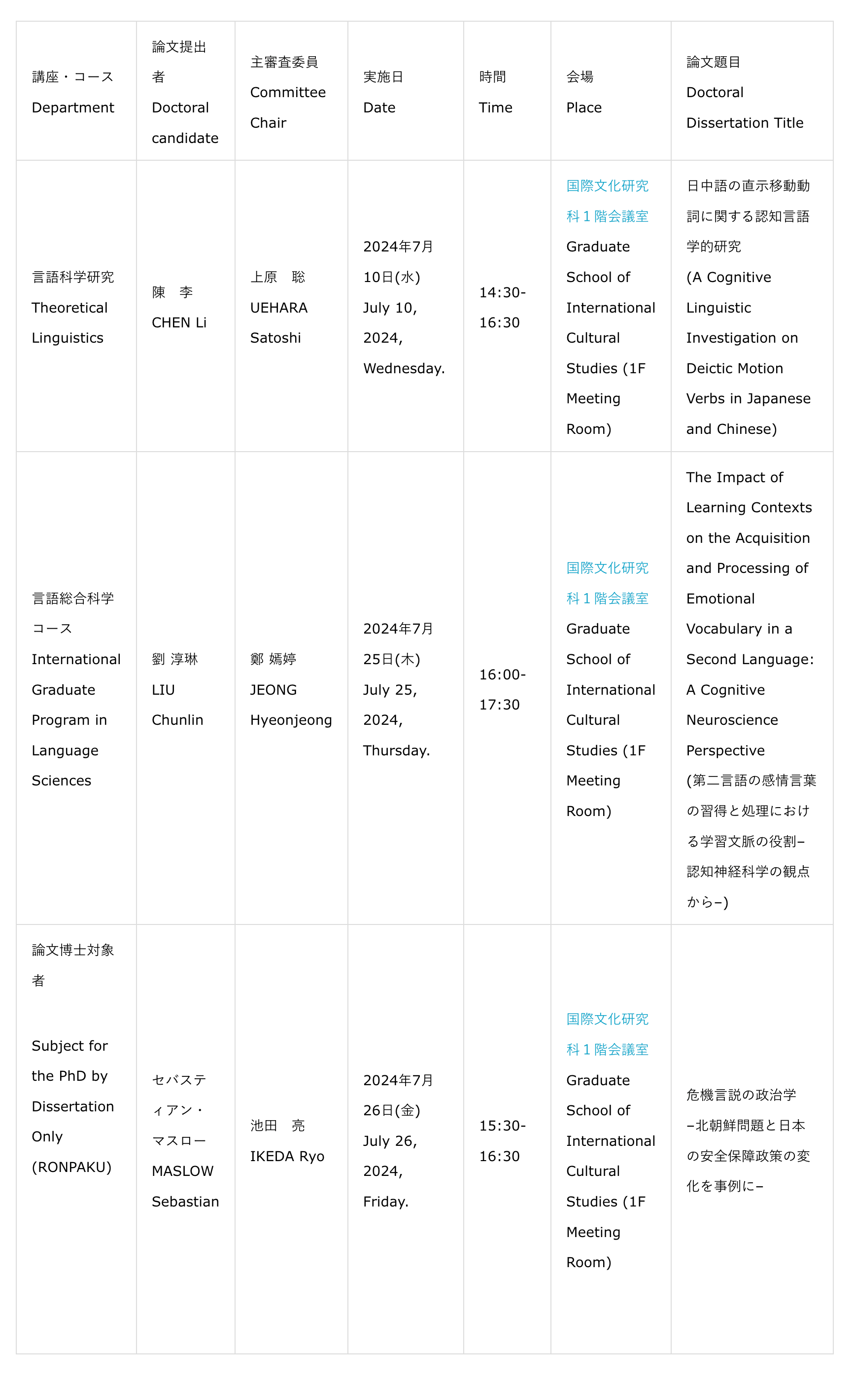 本学では、大学院教育における学位の国際的な通用性を担保するため、博士論文の最終試験・論文博士学力の確認を一般公開いたします。一般の方でも参加出来ます。