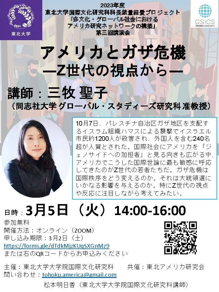 2023年度 東北大学国際文化研究科科長裁量経費プロジェクト 「多文化・グローバル社会におけるアメリカ研究ネットワークの構築」第3回講演会「アメリカとガザ危機―Z世代の視点から」