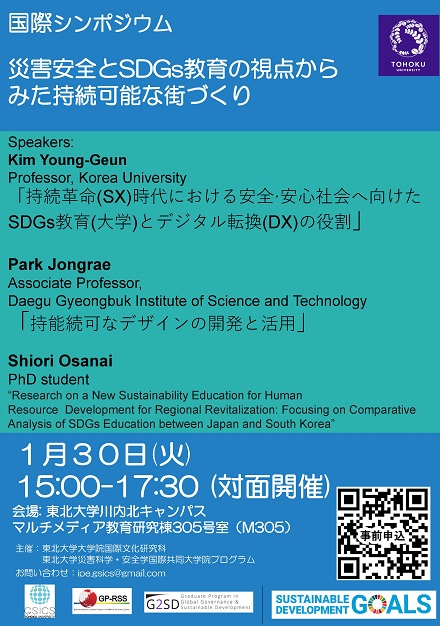 概 要:災害安全とSDGs教育の視点からみた持続可能な街づくりと題して国際シンポジウムを開催します。シンポジウムでは金 暎根 教授(高麗大学文学部/グローバル日本研究院)と 朴 鍾来 准教授(韓国大邱慶北科学技術院 (DGIST)をお招きしたご講演とGP-RSS所属の学生である小山内詩織氏が進めている研究(SDGs教育の現状と課題、および地方都市の持続可能性と教育に関する研究)の成果を発表します。