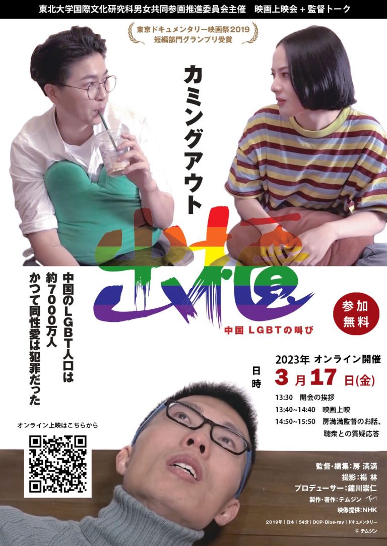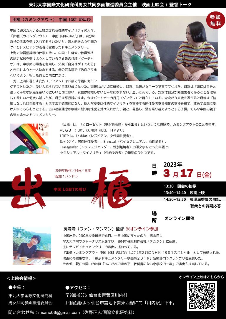 東北大学国際文化研究科男女共同参画推進委員会主催『出櫃(カミングアウト)─中国LGBTの叫び』上映会+監督トーク