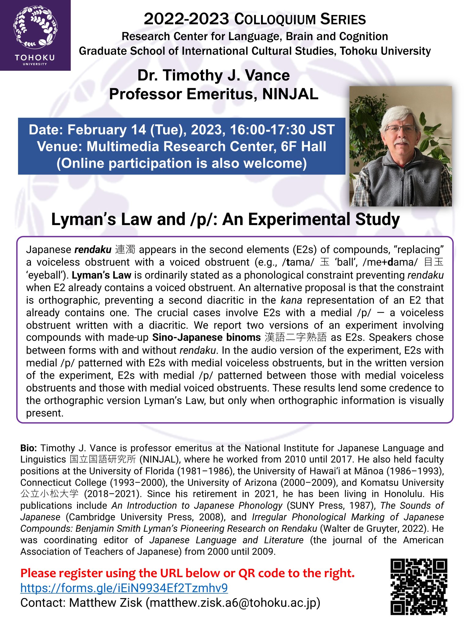 講 師:Dr. Timothy J. Vance (Professor Emeritus, NINJAL)