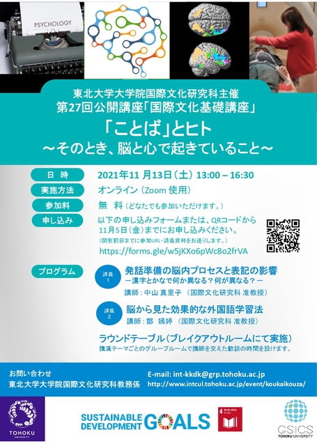 第27回 公開講座「国際文化基礎講座」 「ことば」とヒト ~そのとき、脳と心で起きていること~