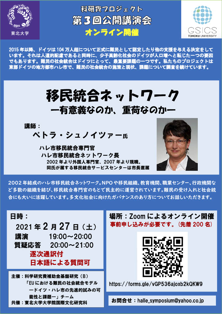 主 催: 科学研究費補助金基盤研究(B)「EU における難民の社会統合モデル ―ドイツ・ハレ市の先進的試みの可能性と課題―」チーム