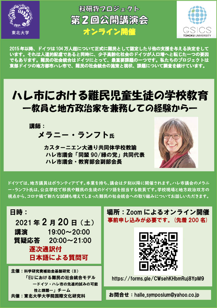 ハレ市議会のメラニー・ランフト氏は、「同盟90/緑の党」共同代表で、市議会教育部会副部会長ですが、本業は公立学校で移民や難民の生徒のドイツ語を担当する教員です。学校現場と地方政治双方の視点から、コロナ禍で新たな試練も増えてしまった難民の社会統合への取り組みについてお話しいただきます。