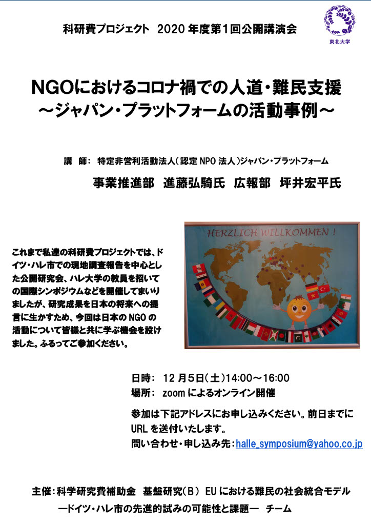 主催:科学研究費補助金 基盤研究(B)「EUにおける難民の社会統合モデル―ドイツ・ハレ市の先進的試みの可能性と課題―」チーム