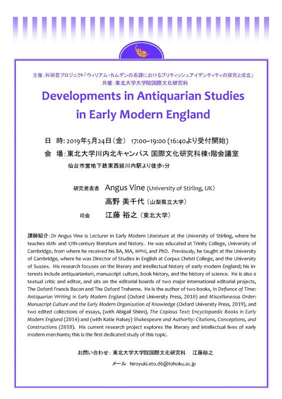 講演会 Developments in Antiquarian Studies in Early Modern England