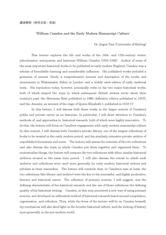 主 催:科研費プロジェクト「ウィリアム・カムデンの系譜におけるブリティッシュアイデンティティの探究と成立」