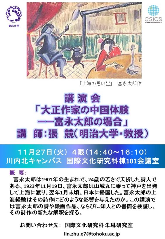 富永太郎は1901年の生まれで、24歳の若さで夭折した詩人である。ボードレールやA.ランポ―らの詩を翻訳するかたわら、『秋の悲嘆』など青春期の感傷を詠う象徴派的な詩集を発表した。1923年11月19日、富永太郎は山城丸に乗って神戸を出発して上海に渡り、翌年1月末頃、日本に帰国した。富永太郎の上海経験はその詩作にどのような影響を与えたのか。この講演では富永太郎の詩や絵画作品、ならびに知人との書簡を検証し、その詩作の新たな解釈を探る。