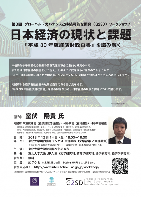 概 要 :本格的な少子高齢化の到来や第四次産業革命の劇的な潮流の中で、私たちは日本経済の展望をどう捉え、どのように舵を取るべきなのでしょうか?「人生100年時代」の人材と働き方、「Society 5.0」に向けた対応はどうあるべきでしょうか? 内閣府から経済財政白書の執筆担当者である室伏氏を招き、『平成30年版経済財政白書』を読み解きながら、日本経済の現状と課題について論じます。