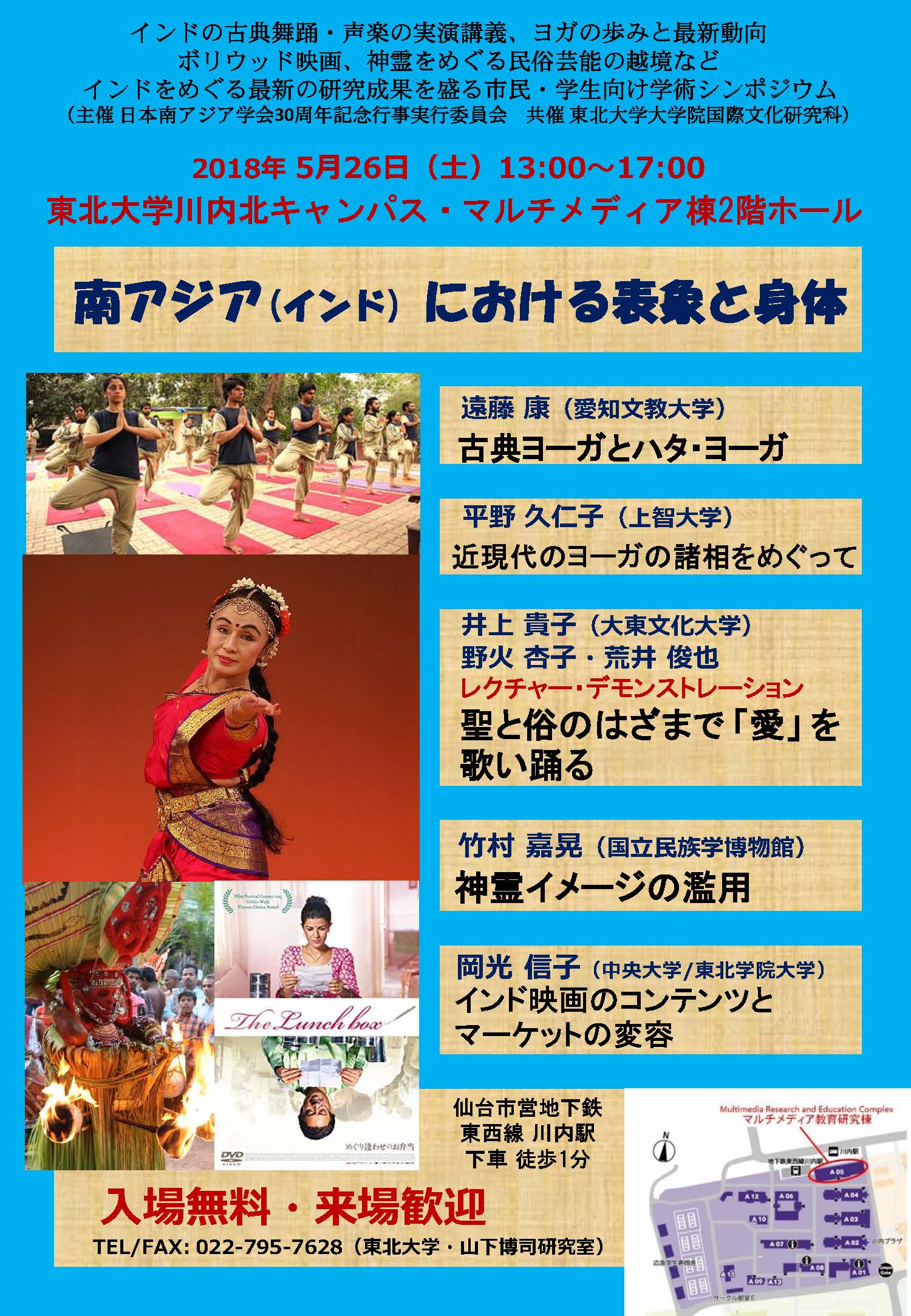 日本南アジア学会設立30周年記念連続シンポジウムの一環。インドの古典舞踊(バラタナーティヤム)および伝統声楽(カルナータカ・サンギータ)の実演と解説、インド起源のヨーガの史的歩みとグローバル化をうけた最新の動き、神霊をめぐる民俗芸能の越境現象、インド(ボリウッド)映画をめぐる最前線など、日本の南アジア研究の到達点を示し、学生・市民に成果発信する文化イベントです。入場無料。事前の予約も不要。ご来場を歓迎いたします。