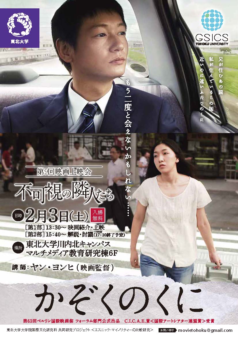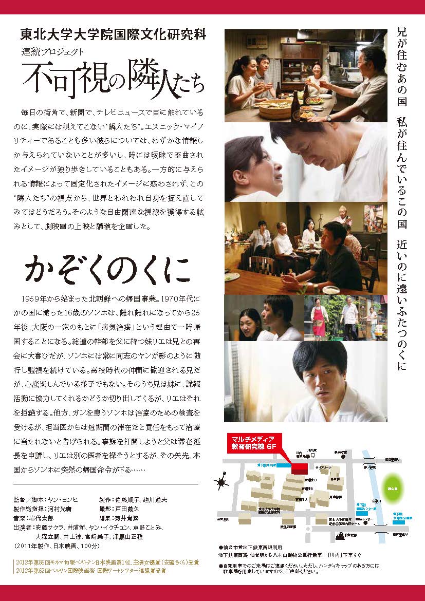 概要: エスニック・マイノリティー比較研究として、在日コリアンの家族を描いた劇映画『かぞくのくに』(2011)を上映し、彼らが現在置かれている状況を考察する。映画監督ヤン・ヨンヒ氏を講師として招き、この作品を製作するに至った経緯などを聞き、最後に参加者からの質疑を募る。