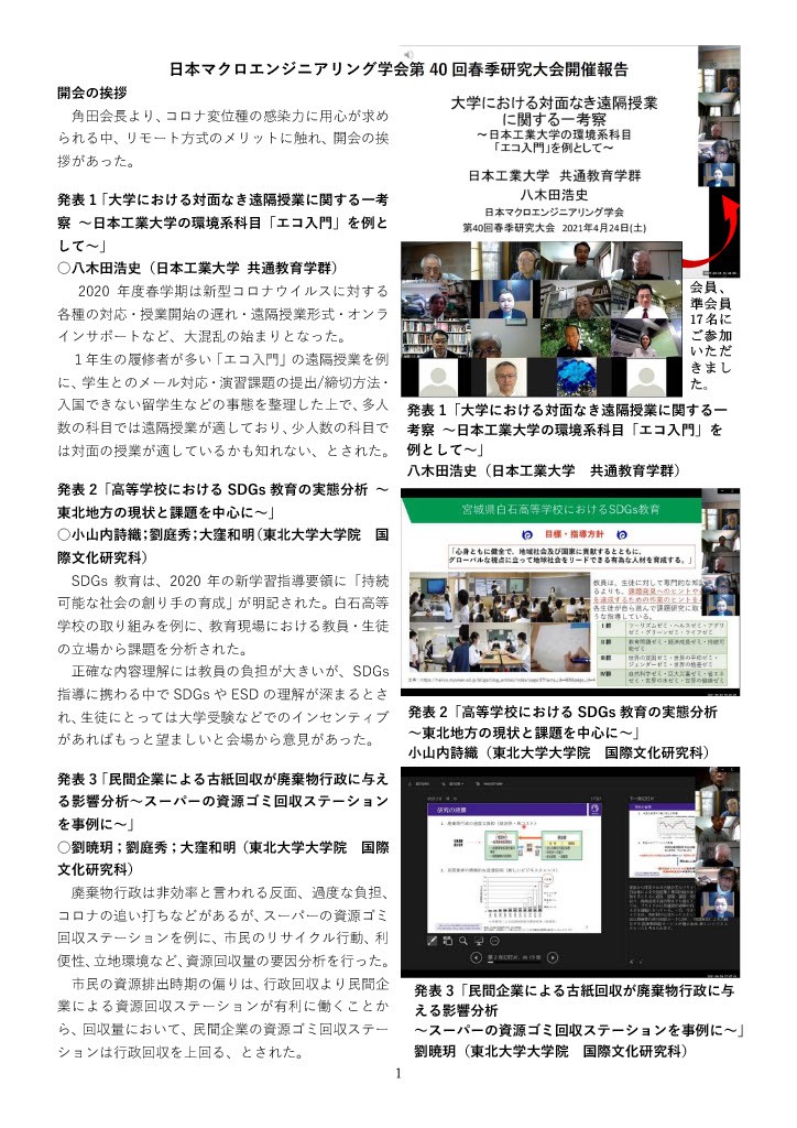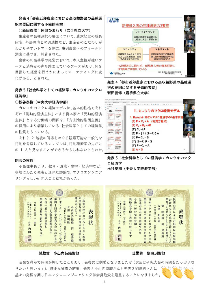第40回日本マクロエンジニアリング学会春季研究大会において本研究科博士後期課程の小山内詩織さんと劉暁玥さんが日本マクロエンジニアリング学会奨励賞を受賞しました