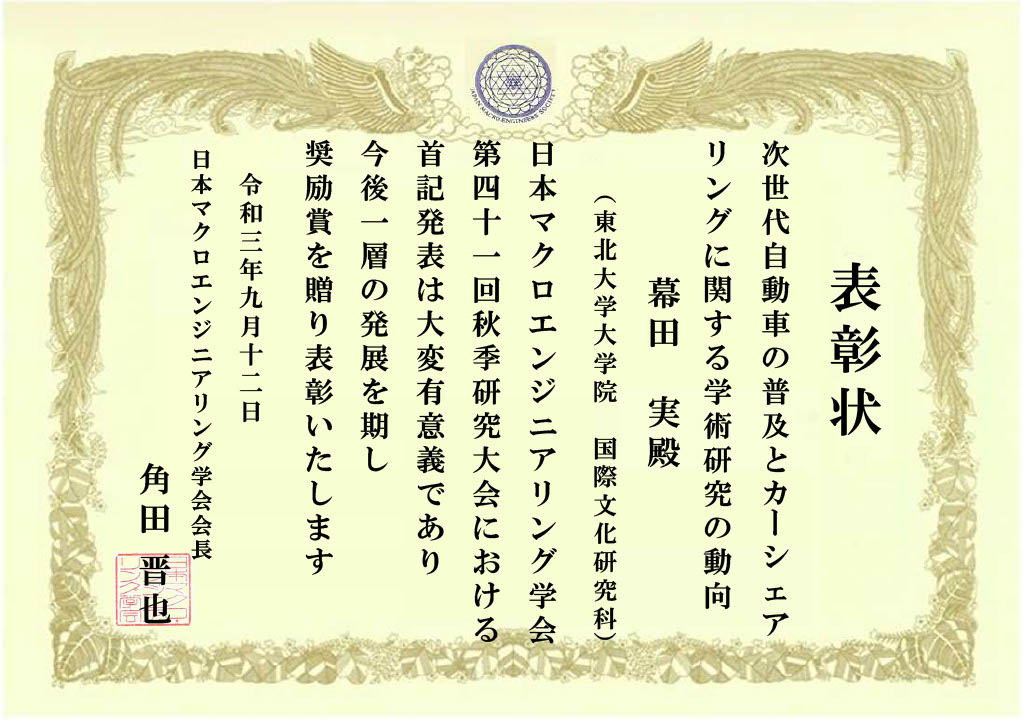 これは同大会で発表した「次世代自動車の普及とカーシェアリングに関する学術研究の動向」が高く評価されたものです。
