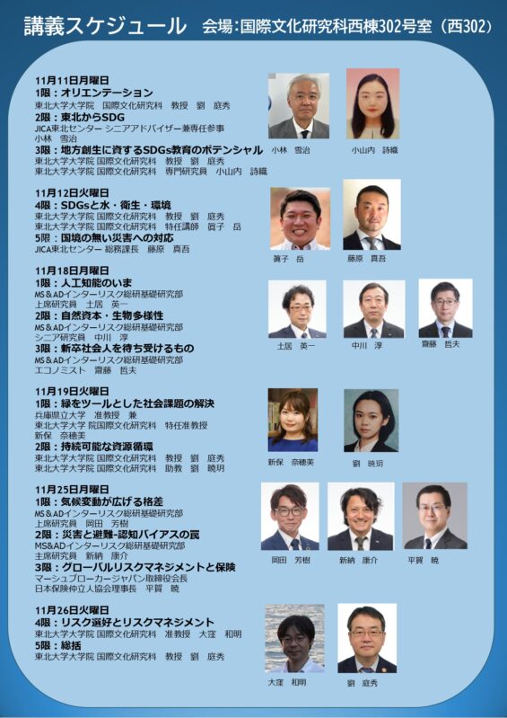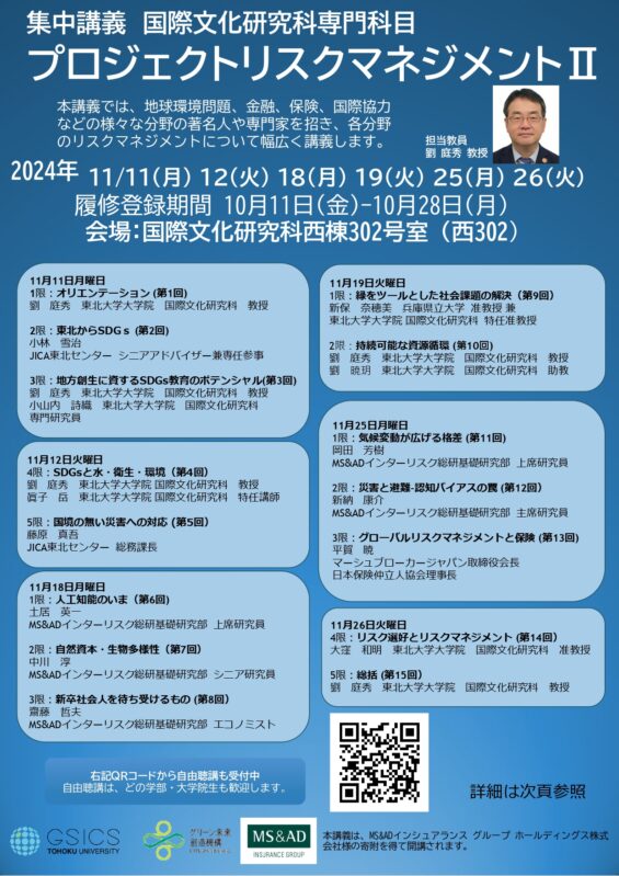 本講義では、地球環境問題、金融、保険、国際協力などの様々な分野の著名人や専門家を招き、各分野のリスクマネジメントについて幅広く講義します。