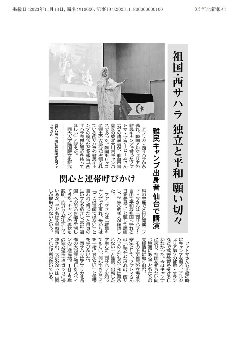 11月8日に開催されました西サハラに関する講演が河北新報に掲載されました
