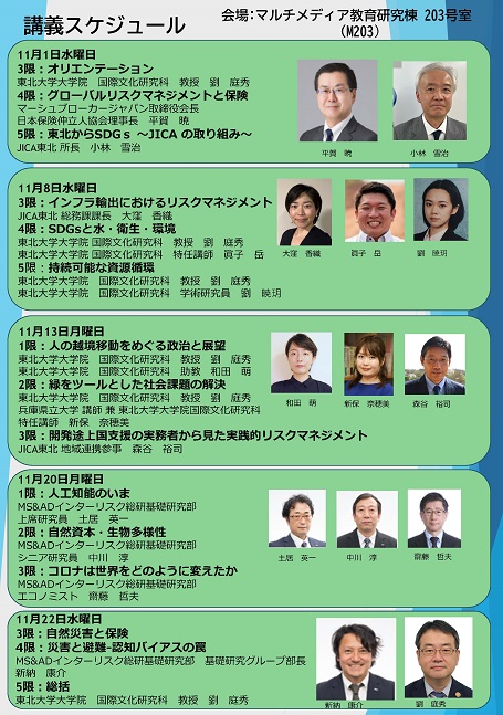 本講義では、地球環境問題、金融、保険、国際協力などの様々な分野の著名人や専門家を招き、各分野のリスクマネジメントについて幅広く講義します。