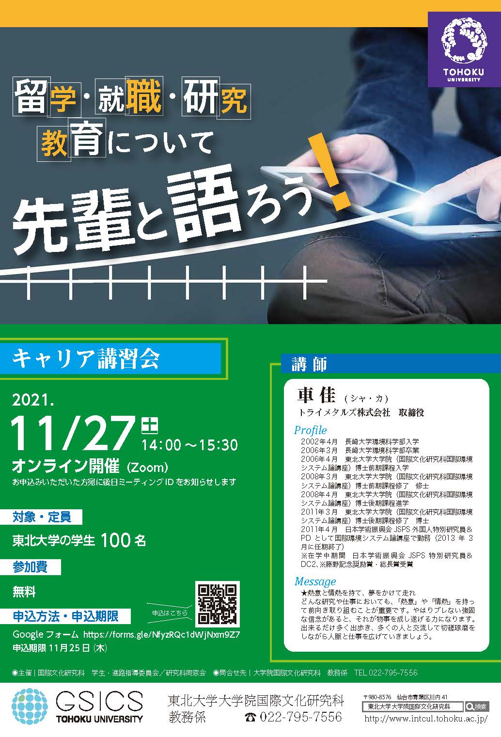 国際文化研究科キャリア講習会「留学・就職・研究・教育について先輩と語ろう」のお知らせ