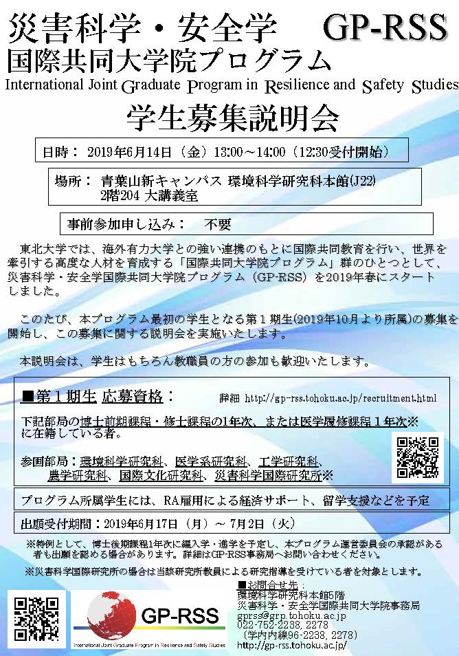 青葉山新キャンパス 環境科学研究科本館2階大講義室を会場に,災害科学・安全学国際共同大学院(GP-RSS)学生募集説明会を開催いたします。